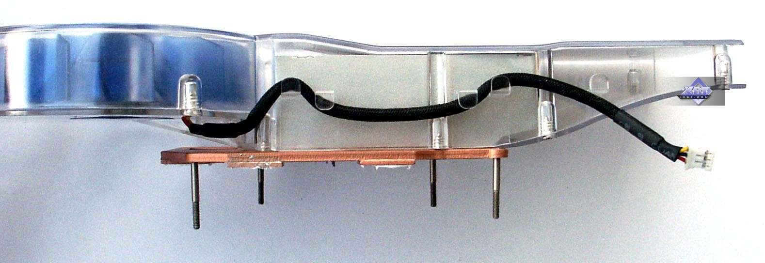 Под кулерами можно увидеть и сам чип. Он упакован по технологии FCPGA, размер кристалла впечатляет (мы уже говорили об этом раньше), разумеется, физически в нем не 12, а 16 конвейеров, просто 4 их них отключены (по логике вещей из-за неработоспособности производится сортировка кристаллов по этому принципу; но возможно, что и по маркетинговым причинам, мы пока еще находимся в состоянии поиска возможности включения таких конвейеров наиболее безболезненным программным путем)