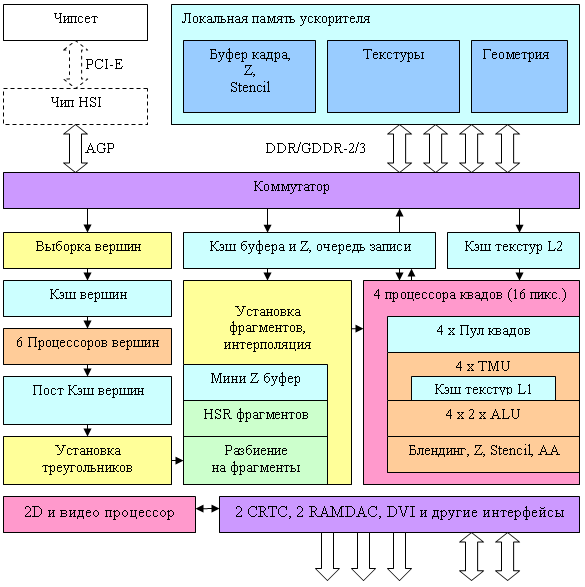 - Все необходимое для поддержки пиксельных и вершинных шейдеров версии 3.0, включая динамические ветвления в пиксельных и вершинных процессорах, выбор значений текстур из вершинных процессоров и т.д.