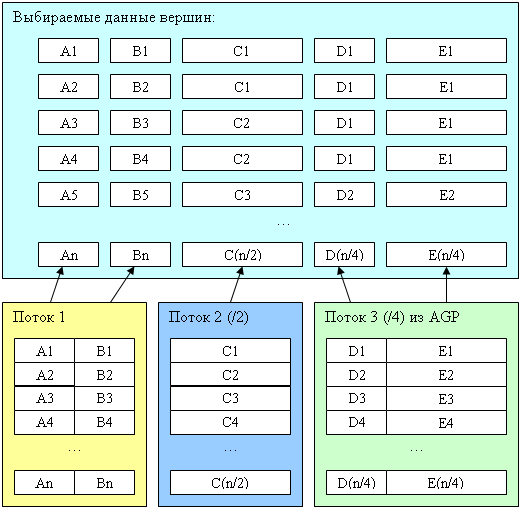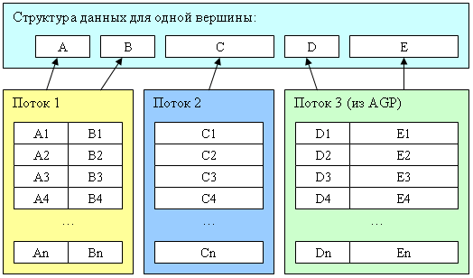 В памяти данные для вершины не обязательно хранятся в виде непрерывного фрагмента — они могут быть разбиты на некоторое число потоков (для NV40 — до 16) в каждом из которых может быть один или несколько параметров. При этом, какие-то потоки могут находить в адресном пространстве AGP (т.е. будут выбираться из системной памяти) а прочие могут быть расположены в локальной памяти ускорителя. Такой подход позволяет повторно использовать одни и те же наборы данных для разных объектов (например, мы можем разделить геометрическую и текстурную информацию по разным потокам и использовать с одной геометрической моделью разные наборы текстурных координат и других параметров поверхности, таким образом, обеспечив внешнее отличие). Кроме того, можно пересылать по AGP (и генерировать в системной памяти) в отдельном потоке только те параметры модели, которые действительно изменились, остальные достаточно один раз загрузить в локальную память ускорителя. Для доступа к параметрам той или иной вершины используется текущий индекс, общий для всех потоков. Этот индекс или хаотически меняется (представление исходных данных в виде индексного буфера) или планомерно увеличивается (отдельные треугольники, полоски и веера).