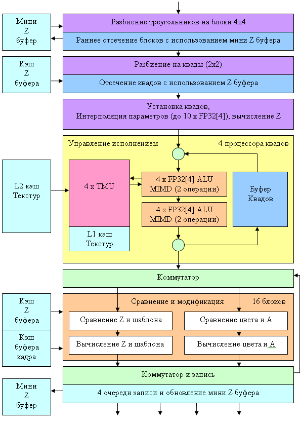А теперь вернемся к нашей схеме и обратим внимание на ее нижнюю часть. Там расположен блок, отвечающий за сравнение и модификацию значений цвета, прозрачности, глубины и буфера шаблонов. Всего у нас 16 таких блоков. Ввиду достаточной однотипности задачи сравнения и модификации, мы можем использовать этот блок в двух режимах: