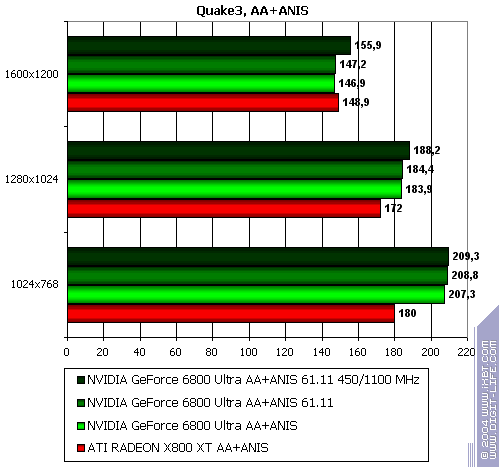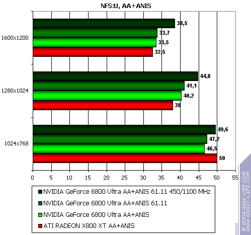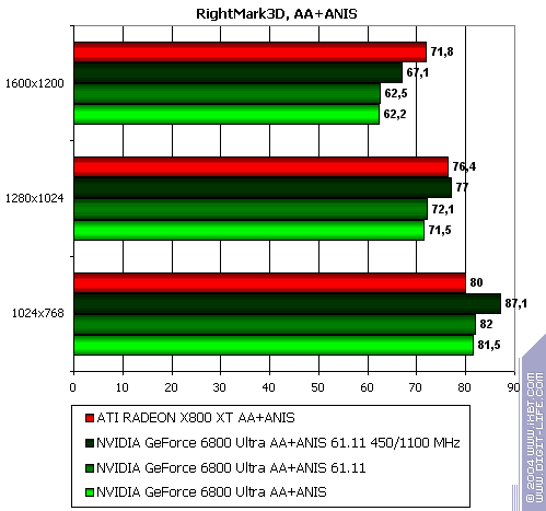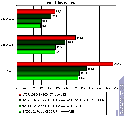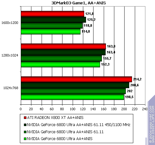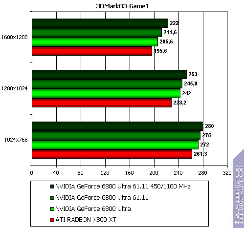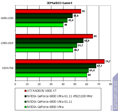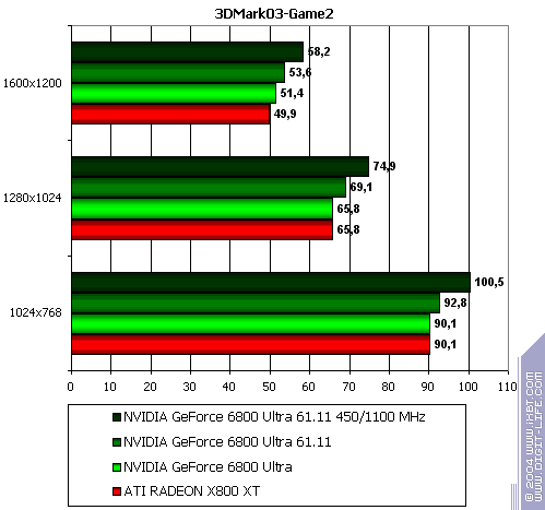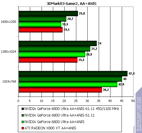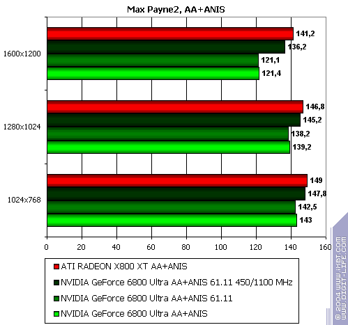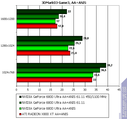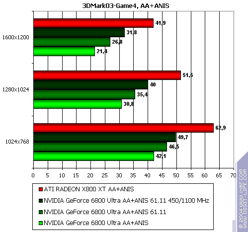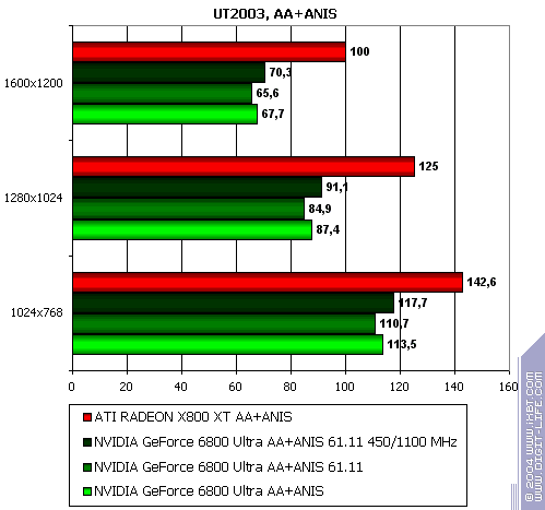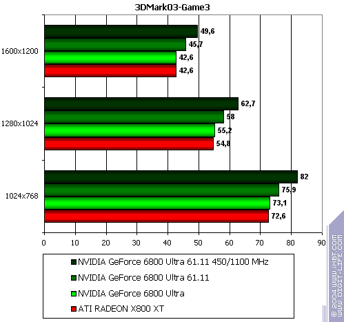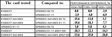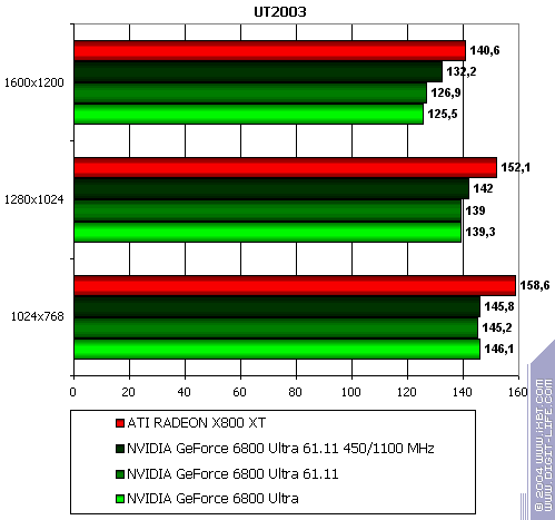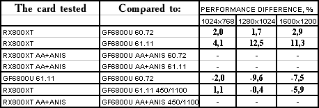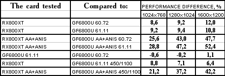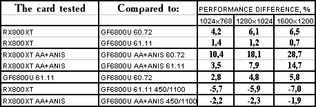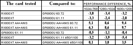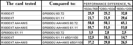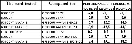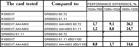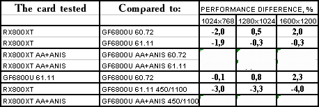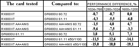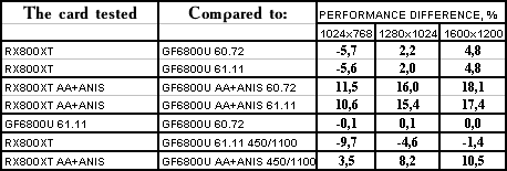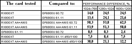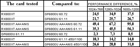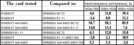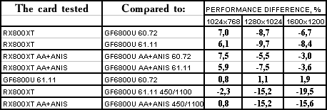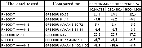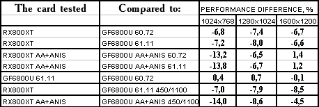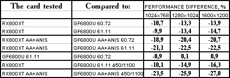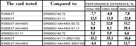 - NVIDIA GeForce 6800 Ultra 450МГц против ATI RADEON X800 XT  проигрыш, если принимать во внимание тяжелые режимы.
