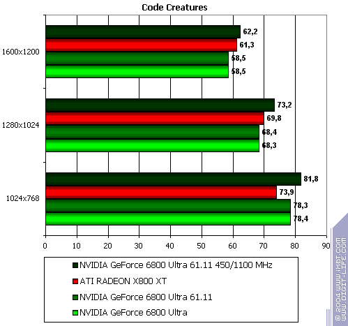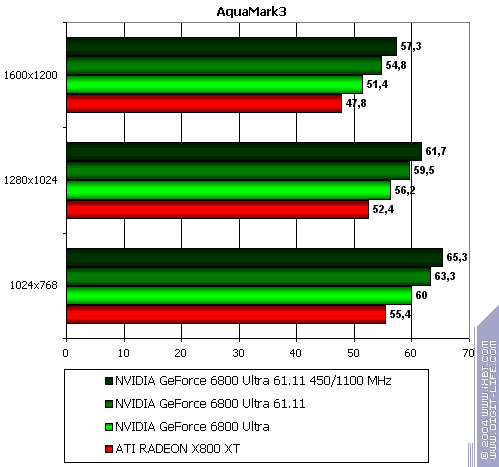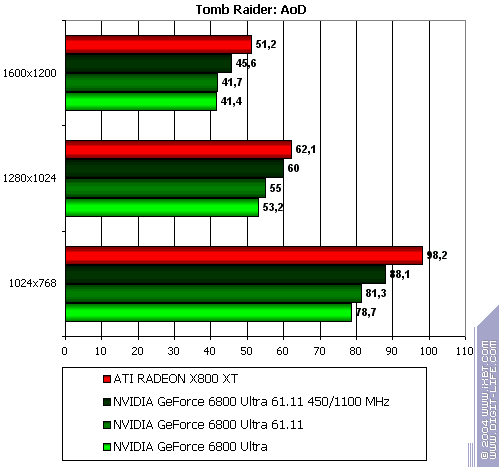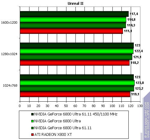 - NVIDIA GeForce 6800 Ultra 450МГц против ATI RADEON X800 XT  из-за ограничений, накладываемых центральным процессором, трудно сделать выводы. Но все же видно, что X800 XT лидирует.