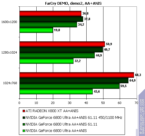 - Хочу отметить также как положительный момент, что новая версия 61.11 для GeForce 6800 Ultra очень неплоха, действительно принесла для ускорителя некоторые приросты без использования «вредных заточек». И очень надеюсь, что разработчики FarCry в патче 1.2 поправят то ужасное положение с качеством NVxx, что мы видели. И тогда сравнение будет более честным и объективным.