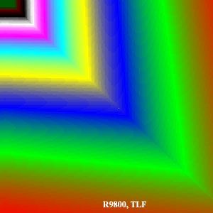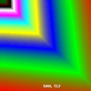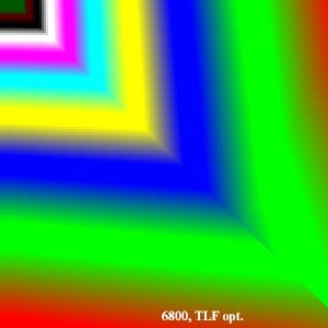 Хорошо видно, что характер оптимизаций ATI и NVIDIA несколько отличается. На цветных уровнях ATI дает своеобразный песок (не виновата ли тут эта самая пресловутая пониженная точность — вместо 8, всего 5бит на компоненту?), NVIDIA — монотонные зоны без положеного в случае канонической трилинейной фильтрации плавного градиента. Лучшая по визуальным признакам фильтрация у NVIDIA в режиме без оптимизации. В общем (по субъективным ощущениям), мы бы расположили участников следующим образом: