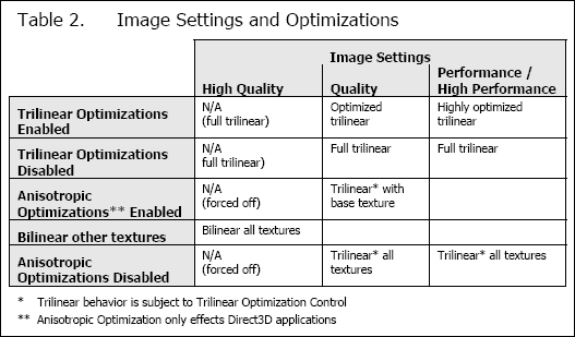 Кроме того, к нам в руки попал документ, объясняющий механизмы работы новых настроек оптимизаций трилинейной и анизотропной фильтрации в драйверах NVIDIA. Так, в режиме High Quality, все оптимизации принудительно отключаются. В режимах же Quality, Performance и High Performance пользователь волен самостоятельно управлять работой оптимизаций — включать и выключать их на собственное усмотрение. Сами же режимы отличаются лишь степенью агрессивности включаемых пользователем оптимизаций.