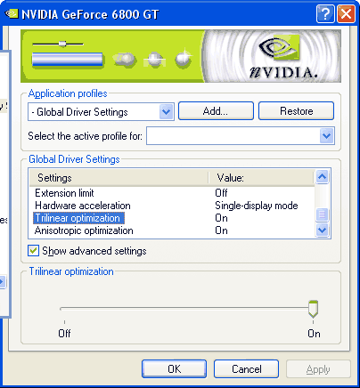 Anisotropic optimizations — это, как ни смешно, еще один старый знакомый, «проживавший» до появления ForceWare 61.34 на видеокартах семейства Radeon 9500+. Здесь всё попроще: в случае активизации этих оптимизаций трилинейная фильтрация выполняется только на первой текстурной стадии, остальные же фильтруются билинейно. На первой текстурной стадии обрабатывается подавляющее большинство основных текстур, в то время как на последующие приходятся карты освещения, карты нормалей и прочие, не слишком нуждающиеся в трилинейной фильтрации текстуры. Но иногда (например, в Mafia и Halo) подобная оптимизация начинает сильно сказываться на качестве изображения.