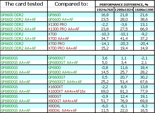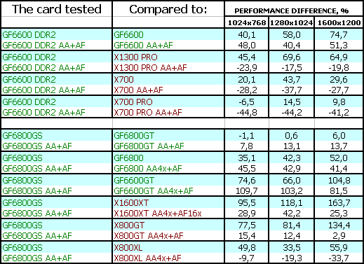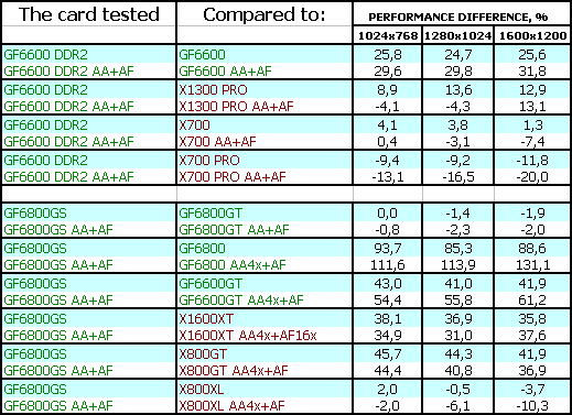 Игра уже довольно проста для современных ускорителей, поэтому даже 6600 DDR2 можно гонять с АА+АФ, и в этих режимах мы видим, что победа опять-таки за новинками от NVIDIA (в том числе и 6800 GS).