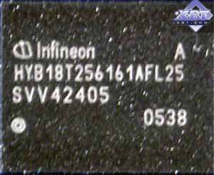 | Карта имеет 256 МБ памяти GDDR2 SDRAM, размещенной в 8-ми микросхемах на лицевой стороне PCB. Микросхемы памяти Infineon. Время выборки у микросхем памяти 2.5 ns, что соответствует частоте работы 400 (800) МГц. | ![]() |