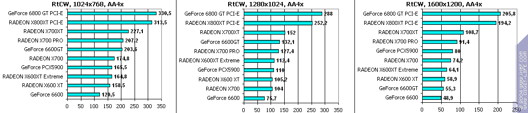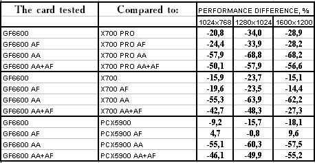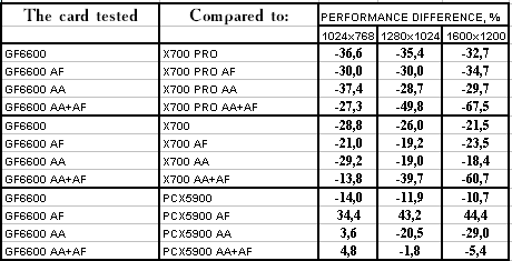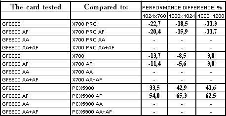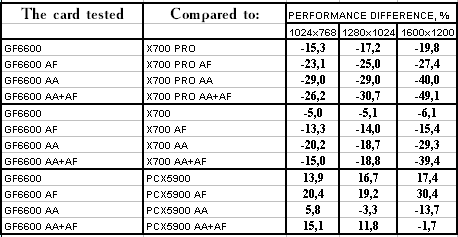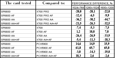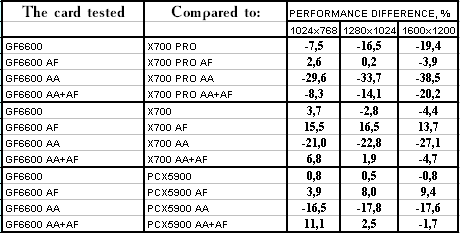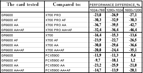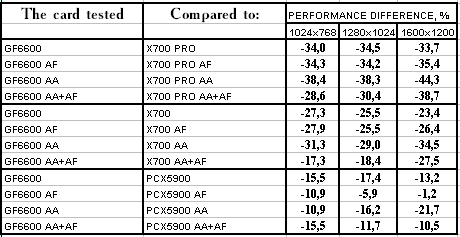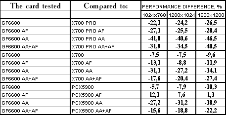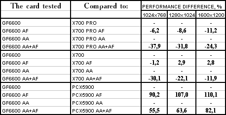 - GeForce 6600 — против RADEON X700 сложные расклады: при АА явный проигрыш (что понятно), при АФ сильный выигрыш, так что паритет.