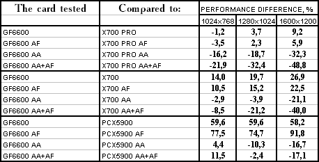 - GeForce 6600 — против GeForce PCX5900 а здесь выигрыш только при АФ, в остальных случаях также поражение.