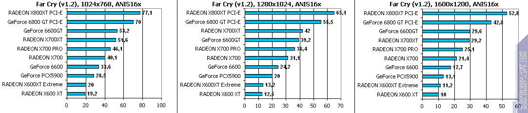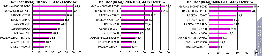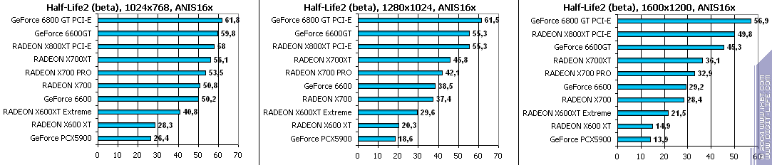 - Half-Life2 (Valve/Sierra) DirectX 9.0, demo ixbt07. Тестирование проводилось при включенной анизотропной фильтрации, а также в тяжелом режиме с АА и анизотропией.