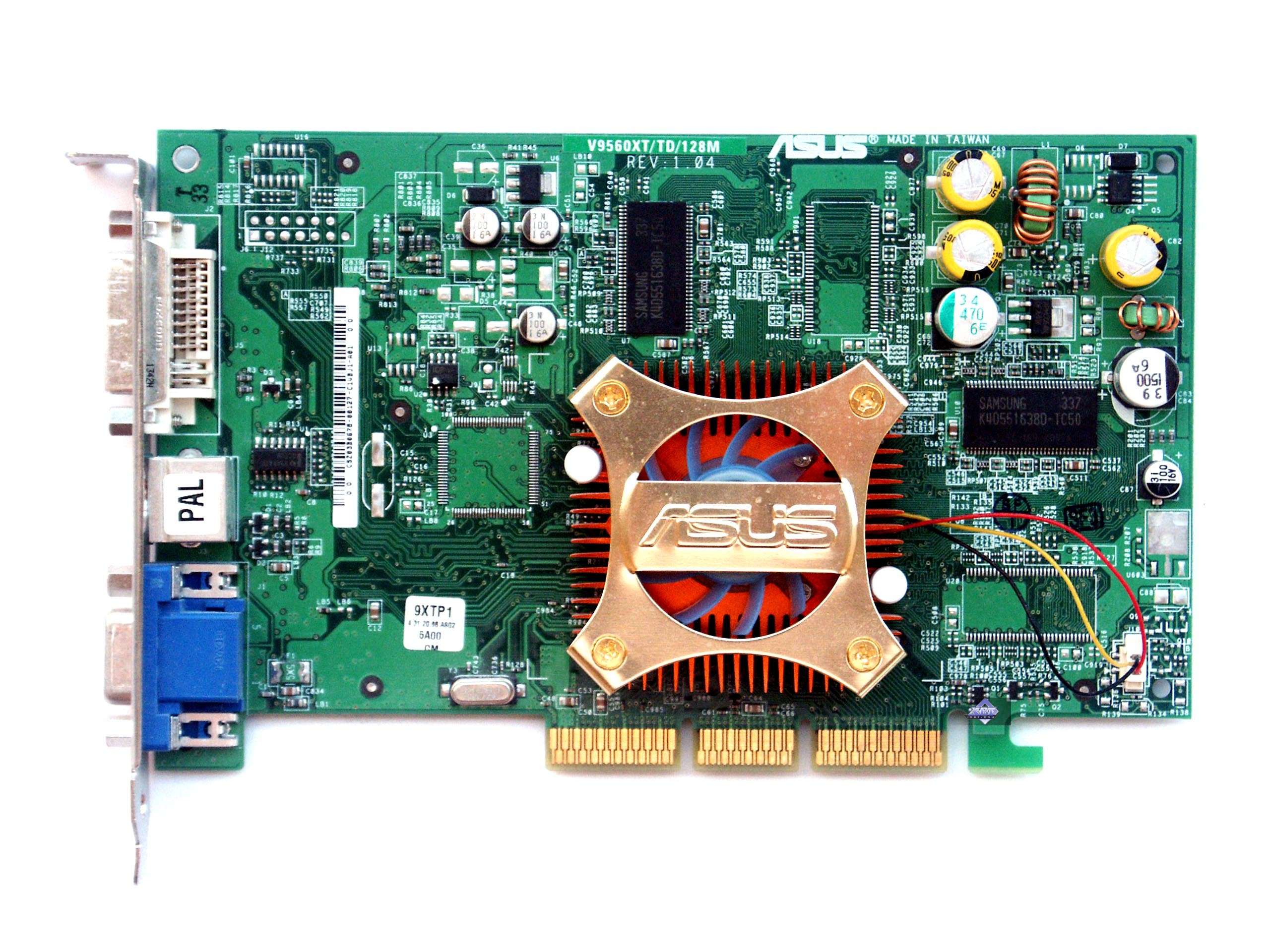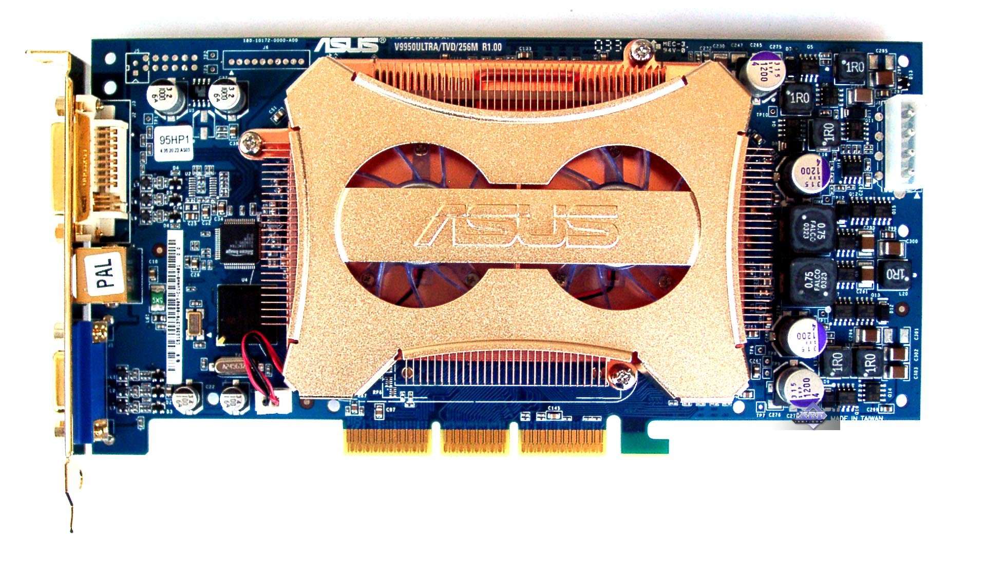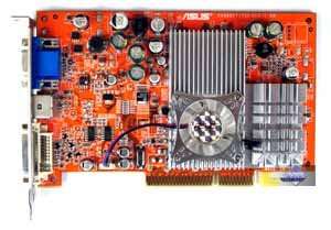 | ASUS V9950 Ultra 256MB 256bit, 450/425 (850) MHz (4 пиксельных конвейера с 2-мя текстурными блоками на каждом, до 16 текстур за проход, до 8-ми отсчетов Z, поддержка DirectX 9.0, шейдерная модель версии 2.0+, блок аппаратной обработки геометрии и освещения базируется на трех вершинных конвейерах) |  |