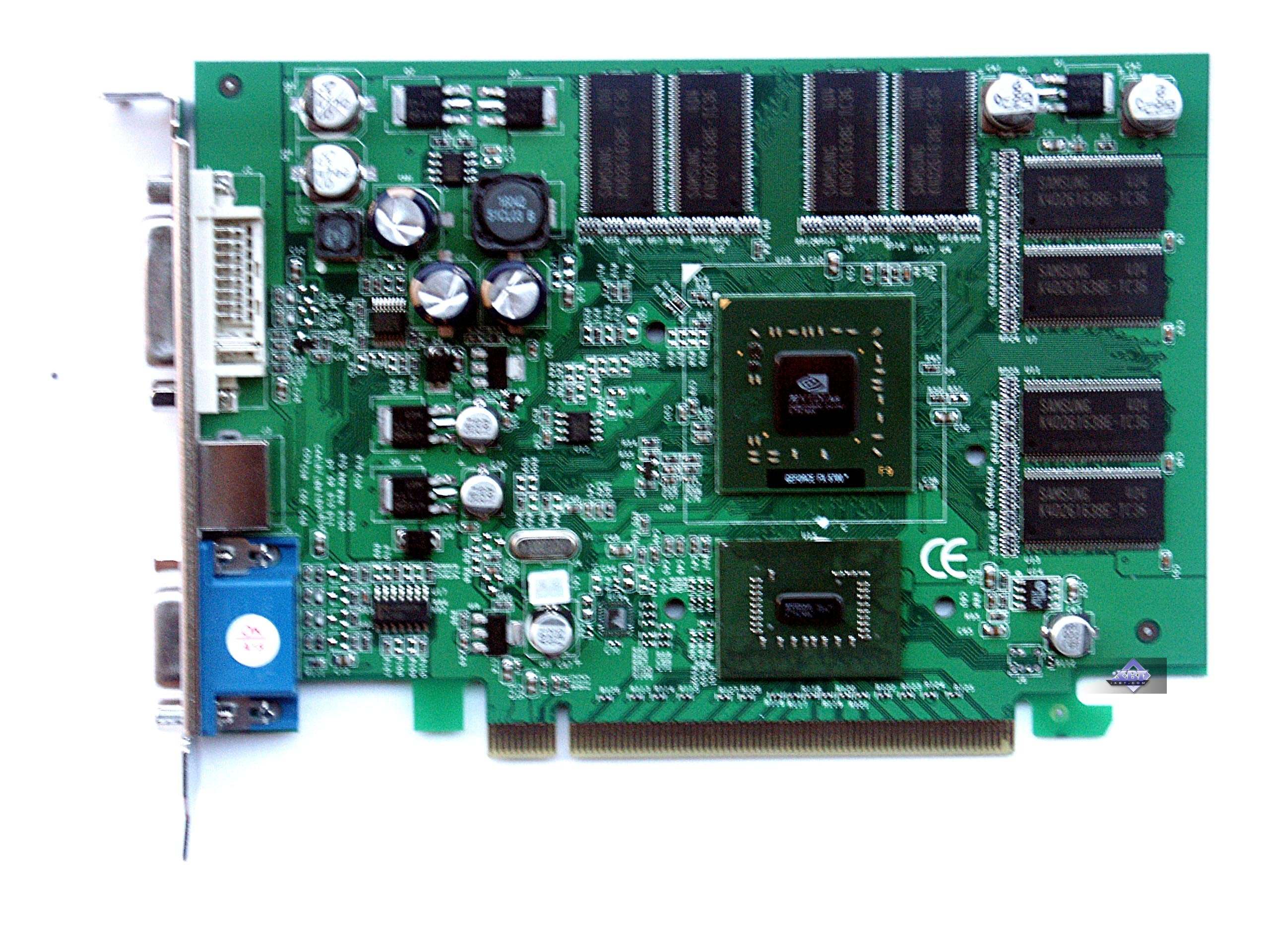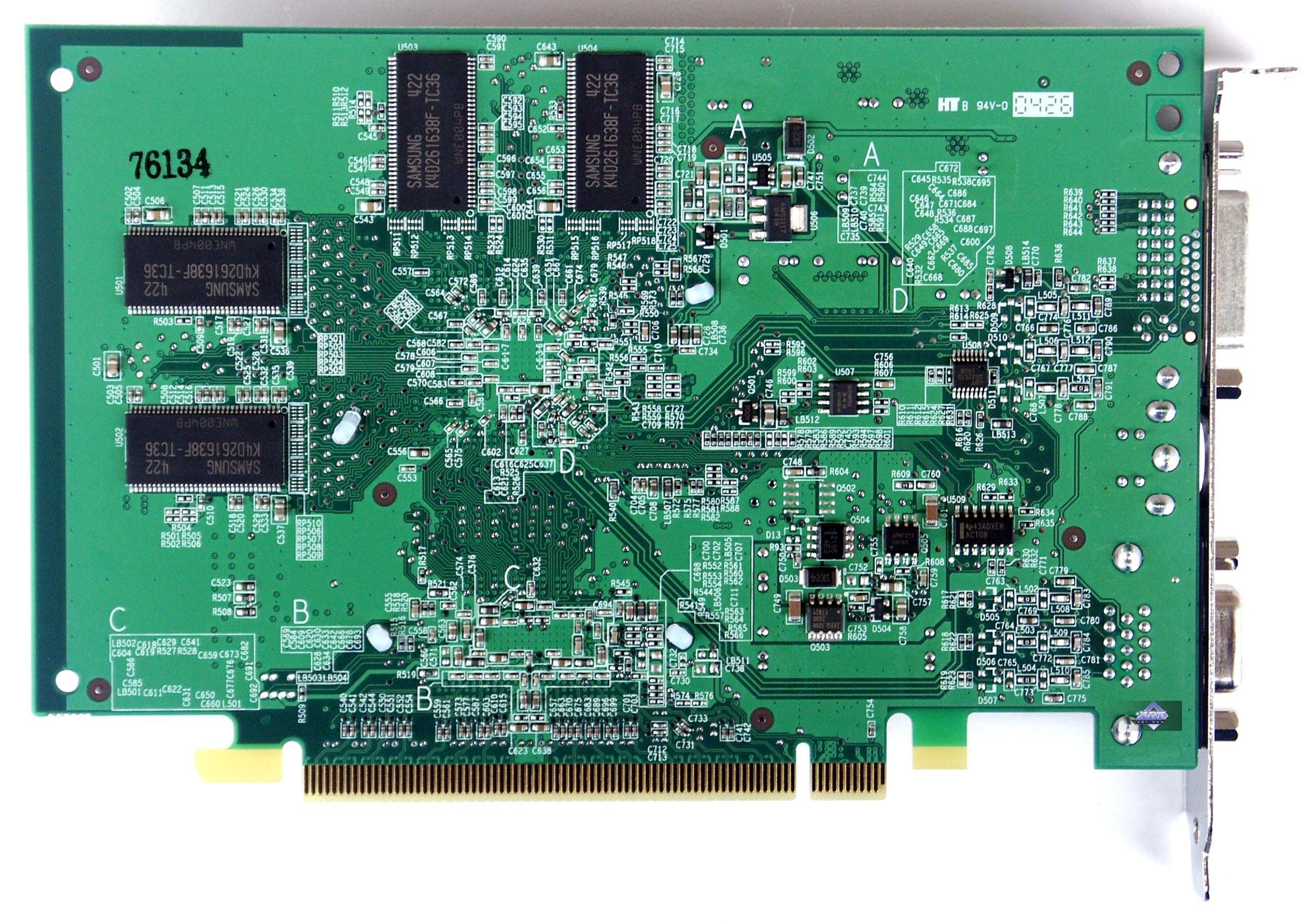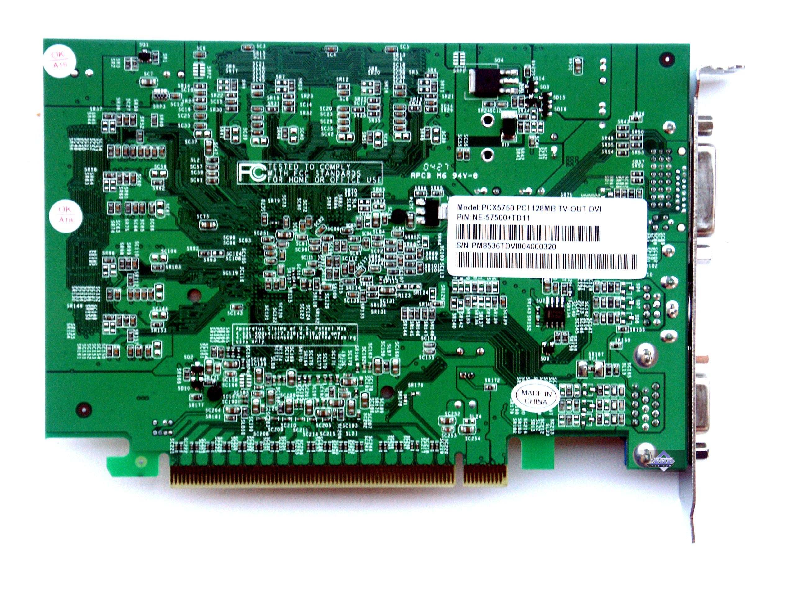 Можно еще раз увидеть, что в качестве ядра у PCX5750 выступает тот же GeForce FX 5700, только в немного уменьшенном корпусе, плюс установлен мост HSI, переводящий интерфейсы AGP-PCX и обратно.