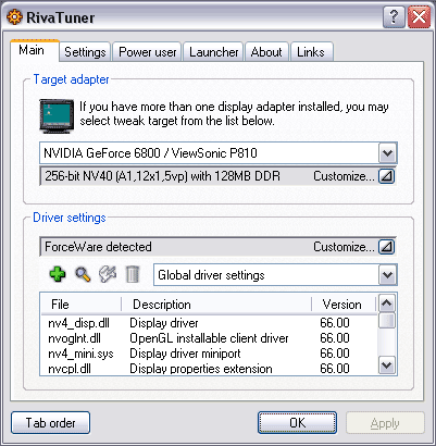 Заканчивая рассмотрение самих карт, я вернусь к теме, что поднял в начале статьи: число конвейеров у GeForce 6800. Я повторю, что исследования выявили, что у таких чипов выключены не только 4 пиксельных, но и 1 (а то и 2) вершинный конвейер. В доказательство того приведу скриншот из бета-версии RivaTuner-а, который, к моменту выхода статьи, надеюсь, уже выйдет в свет. В строке параметров карты можно увидеть в скобках (12х1) — это число пиксельных конвейеров (по одному текстурному блоку на каждый), а также 5vp — это число вершинных (vertex pipelines).