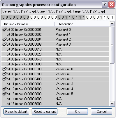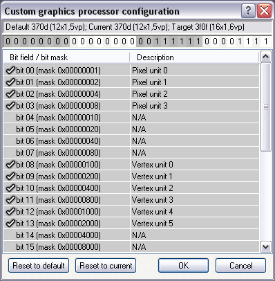 На следующем скриншоте видно, какие именно конвейеры выключены. Мы все знаем, что у NV40 все пиксельные конвейеры работают в связке по 4 (quad), поэтому первые 4 линейки — это как раз quad-ы, и один из них выключен. И нет галочки около одного из вершинных конвейеров (всего их 6).