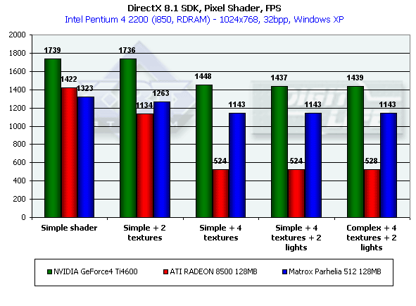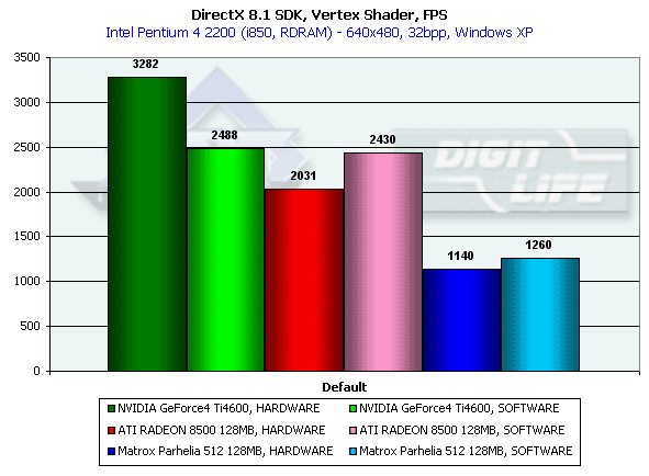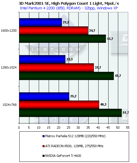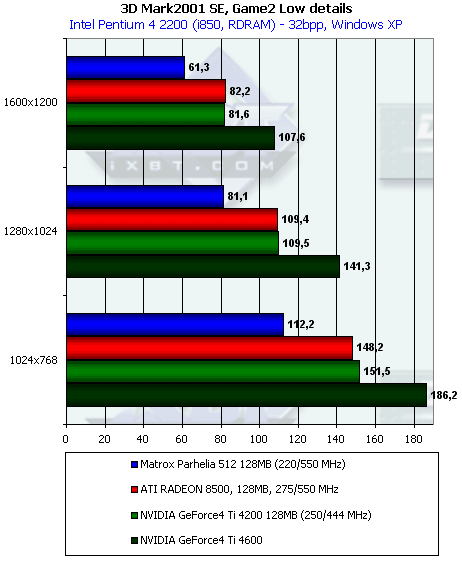 Учитывая особенность работы этого теста с RADEON 8500 (см. 3DGiТоги), мы провели этот тест на стенде на базе VIA KT333 (Athlon XP). Известно, что это приложение активно использует вершинные шейдеры. А что мы имеем у Parhelia? Снова проигрыш везде. Увы.
