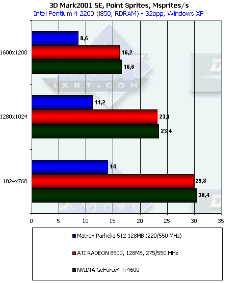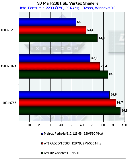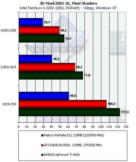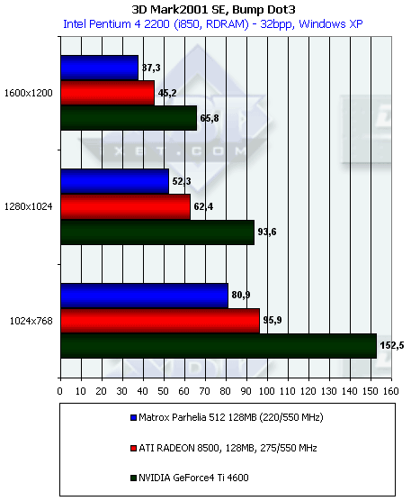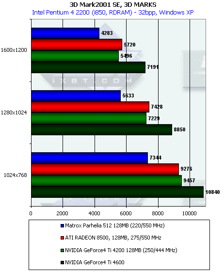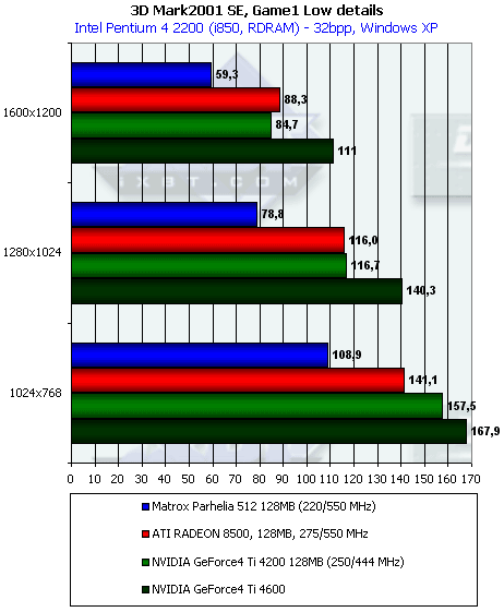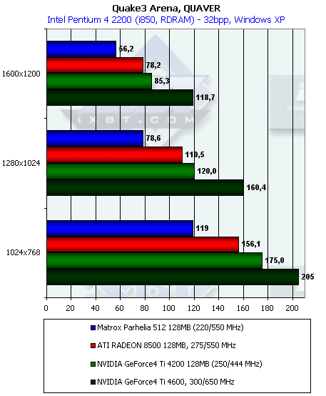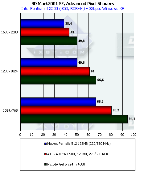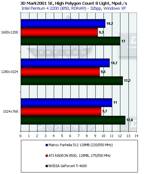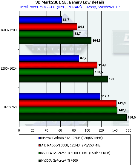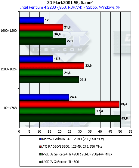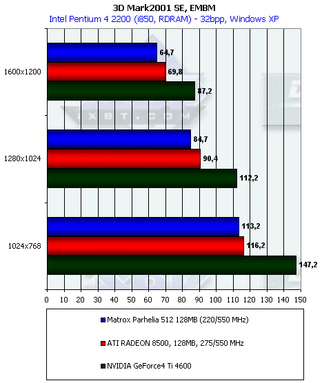 Отставание у Parhelia в разрешении 1600х1200х32 таково: от Ti 4600 — 46.7%, от Ti 4200 — 30%, от RADEON 8500 — 32.8%.