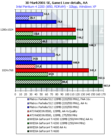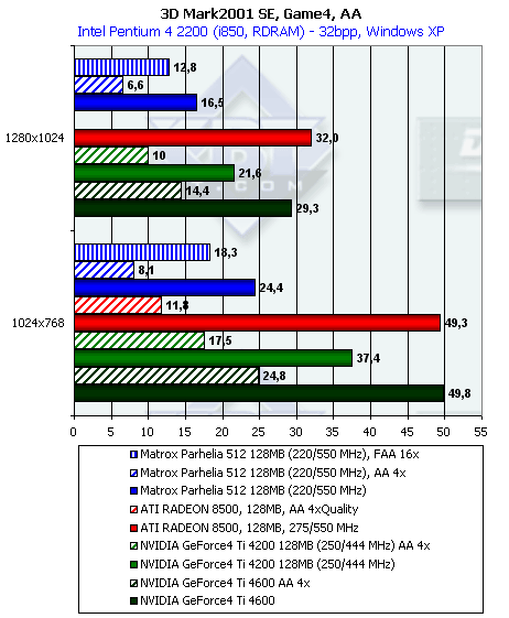 Результаты для Parhelia просто катастрофичны! И даже FAA не помогает карте догнать лидера. Впрочем, Ti 4200 при AA4x в 1280х1024 все же проиграл, но это даже не серьезно.