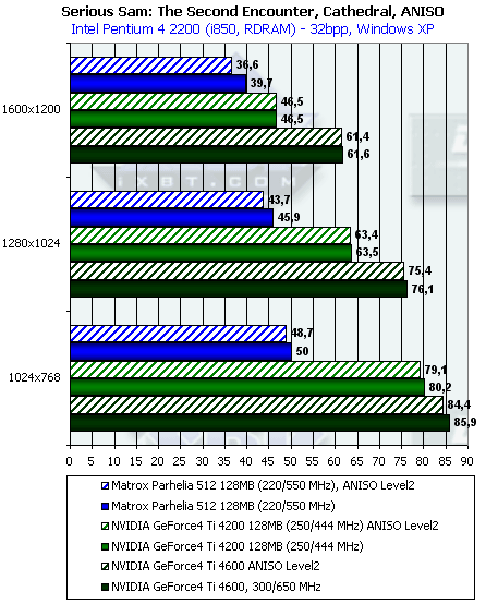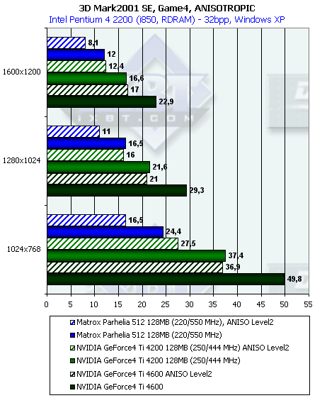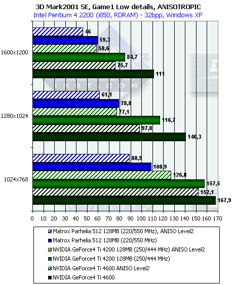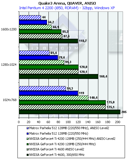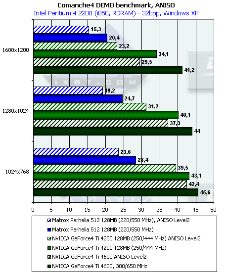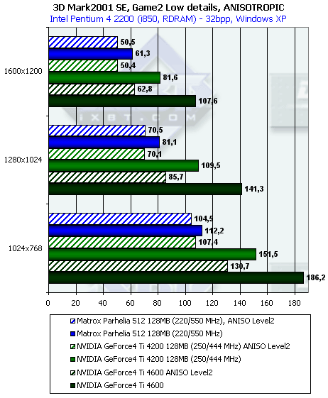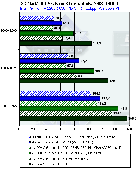 В данном тесте падение производительности при активизации анизотропии у Parhelia сильно меньше, чем у GeForce4 Ti.