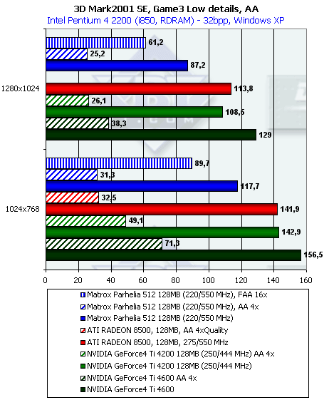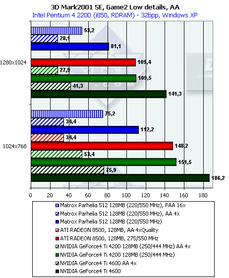 А в данном тесте Parhelia не помогло и включение FAA 16x, скорость очень низкая. Впрочем, сам этот тест весьма сложен, хотя компания ATI в свое время смогла как-то найти способ оптимизации работы своих карт в Game4, с тех пор этот тест — "королевский" для RADEON 8500.