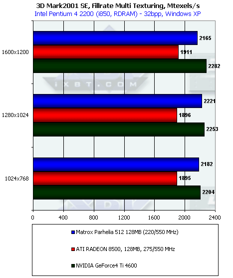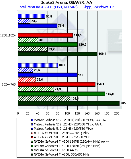 Отставание у Parhelia в разрешении 1600х1200х32 таково: от Ti 4600 — 41%, от Ti 4200 — 21.6%, от RADEON 8500 — 26.6%.