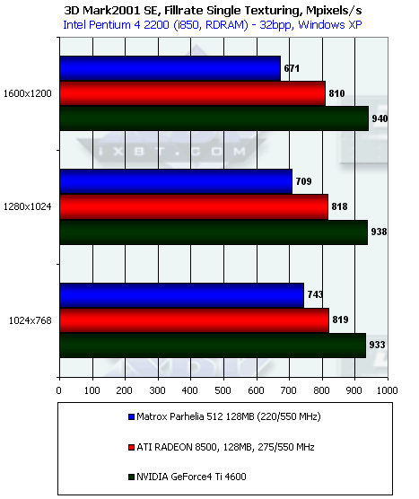 Отставание у Parhelia в разрешении 1600х1200х32 таково: от Ti 4600 — 43%, от Ti 4200 — 24.8%, от RADEON 8500 — 25.4%.