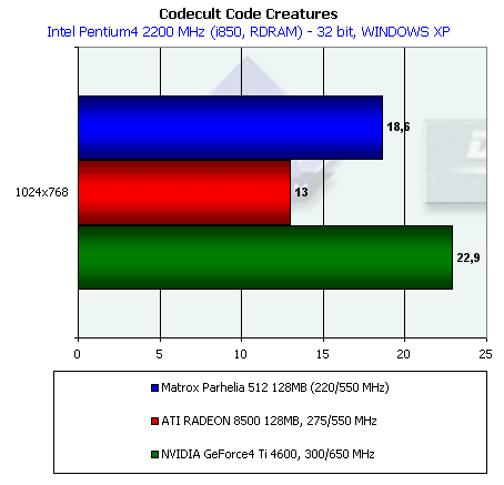 Отставание у Parhelia в разрешении 1600х1200х32 таково: от Ti 4600 — 47.6%, от Ti 4200 — 27.6%, от RADEON 8500 — 44%.