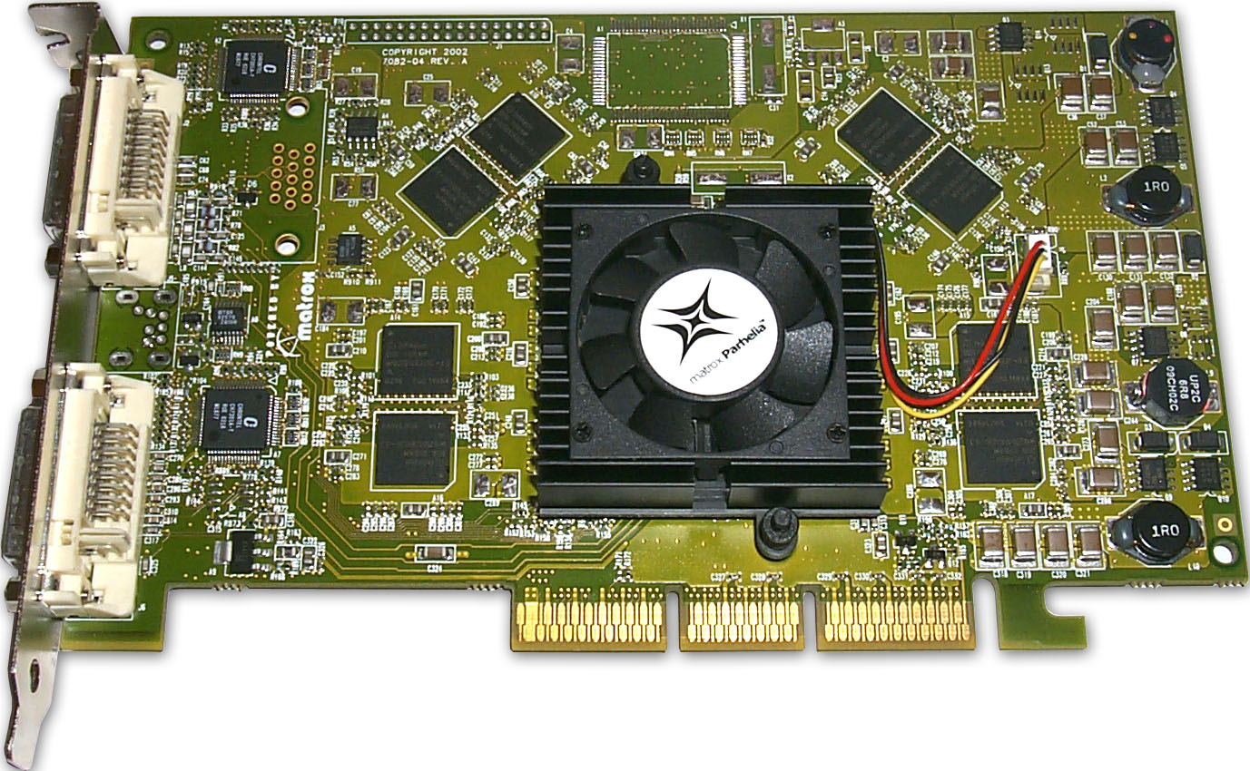 - Parhelia 128MB (OEM) — 200 МГц ядро, 128 МБ 250(500) МГц 256 бит DDR памяти.