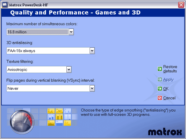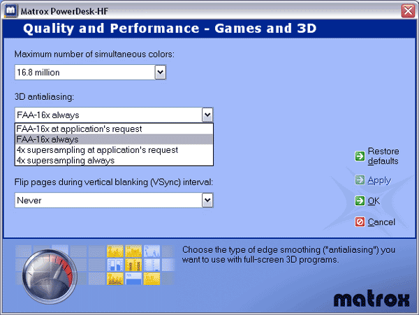 Рекомендую еще раз почитать наш аналитический материал по Matrox Parhelia, где доступно описан новый метод АА, предлагаемый Matrox. По своей сути это суперсэмплинг, до 16 отсчетов на одну точку экрана. Но, выполняется он ТОЛЬКО (!) для точек принадлежащих краям полигонов (всего 3..5% типичной сцены):