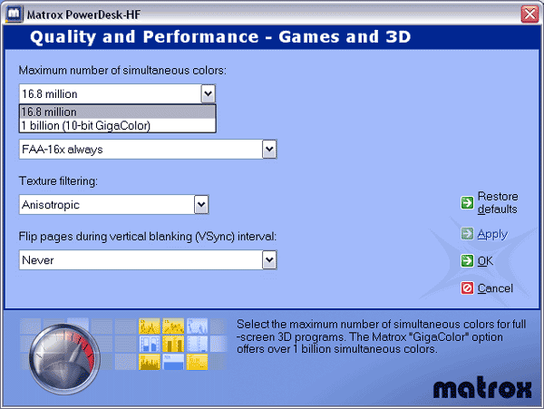 - Наличие у Parhelia поддержки GigaColor (32bit, но по новой схеме 10+10+10+2) пока мало кому понадобится, а в 3D вообще вряд ли будет нужно вообще.