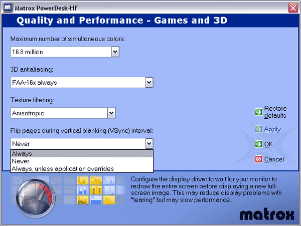 И последнее. Как было сказано выше, в настройках драйверов у Parhelia есть возможность форсирования трилинейной фильтрации. Должен сказать, что это работает во всех играх. И даже если приложение само может управлять фильтрациями, то в наличии будет все равно трилинейка, причем "честная":