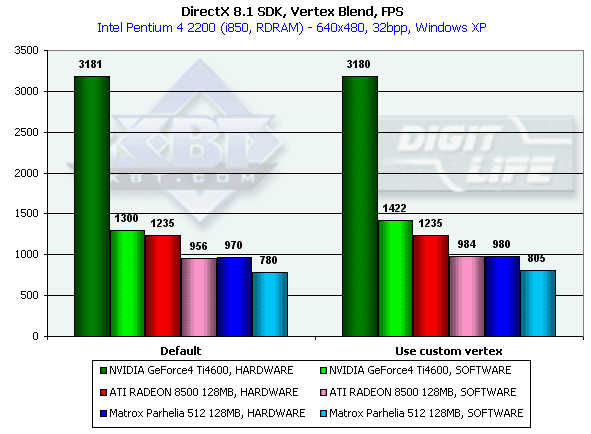 - Вершинные шейдеры версии 2.0 (Vertex Shader 2.0), четыре параллельных исполняющих блока (В текущих драйверах имеется поддержка вершинных шейдеров только версии 1.1 (а не 2.0 из-за отсутствия DirectX 9.0), да и скорость работы вершинных шейдеров заставляет усомниться в том, что задействованы 4 конвейера)