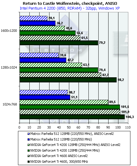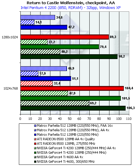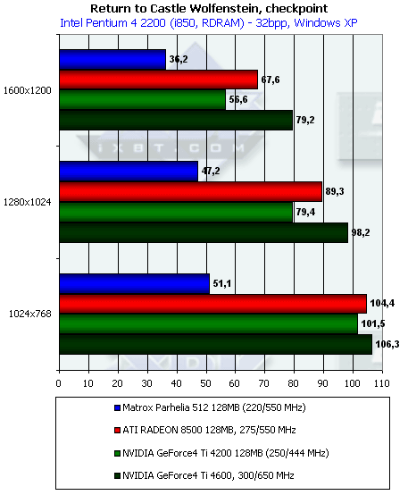 - Return to Castle Wolfenstein (MultiPlayer) (id Software/Activision) — OpenGL, мультитекстурирование, Checkpoint-demo, настройки тестирования — все на максимально возможном уровне, S3TC OFF, конфигурации можно скачать тут