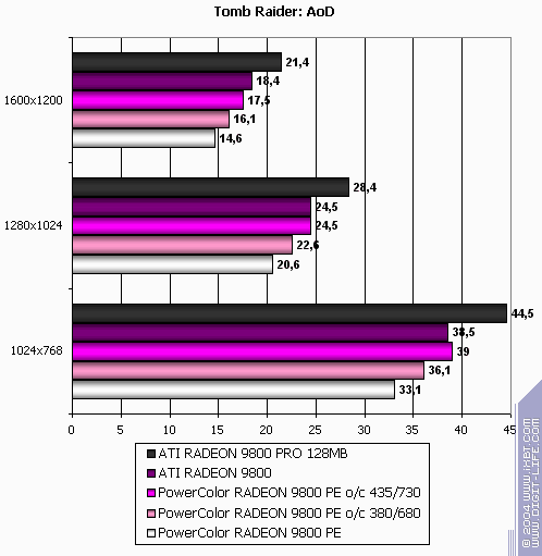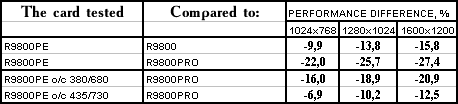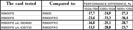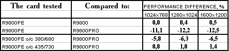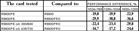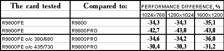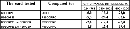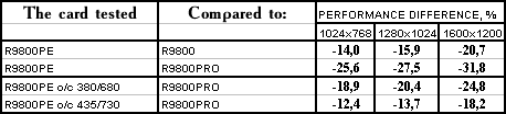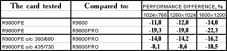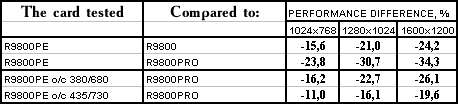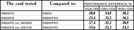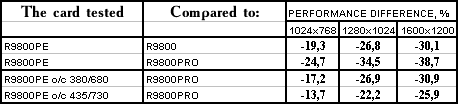 - PowerColor RADEON 9800 Platinum Edition o/c 380/680 MHz против ATI RADEON 9800 PRO  однако с ростом частот все же нехватка ПСП дает о себе знать, и потому уже проигрыш.