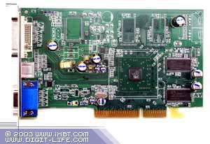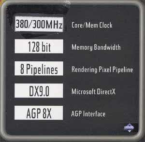 | Карта имеет интерфейс AGP x8/x4, 128 МБ памяти DDR SDRAM размещенной в 4-х микросхемах на лицевой и оборотной сторонах PCB. Микросхемы памяти Hynix. Время выборки у микросхем памяти 3.3 ns, что соответствует частоте работы 300 (600) МГц, на которой память и работает. Частота работы GPU  380 MHz. Шина обмена с памятью — 128 bit. Число пиксельных конвейеров X число текстурных блоков — 8x1. |  |