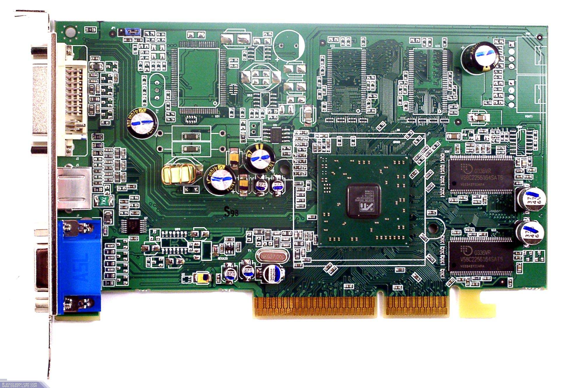 Прекрасно видно, что PowerColor RADEON 9800 Platinum Edition основан на дизайне от RADEON 9700. Просто не установили половину микросхем памяти, урезав шину таким образом в 2 раза. Еще раз замечу, что на такие карты идут чипы с бракованным контроллером памяти, способным работать только со 128-битной шиной. То есть тут дело не в жадности производителя, что он не поставил 4 микросхемы памяти. А в том, что R360, что ставятся на эти карты, имеют некоторый брак.
