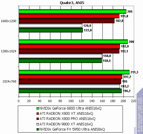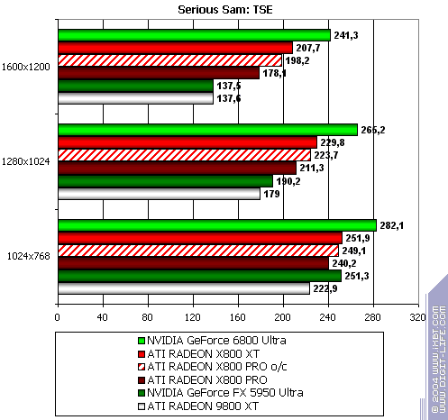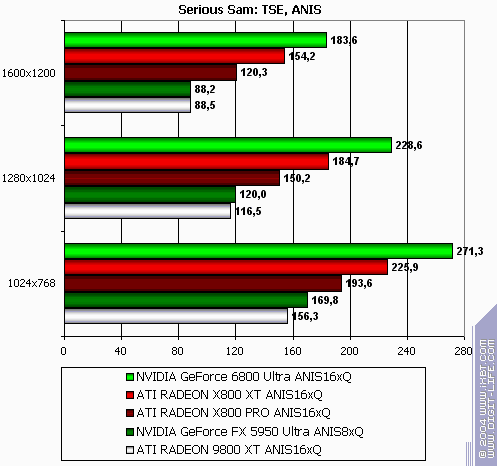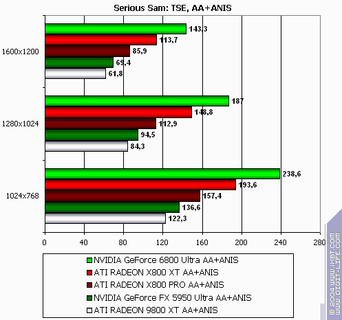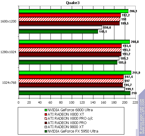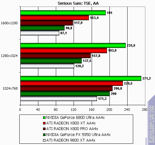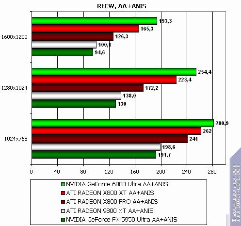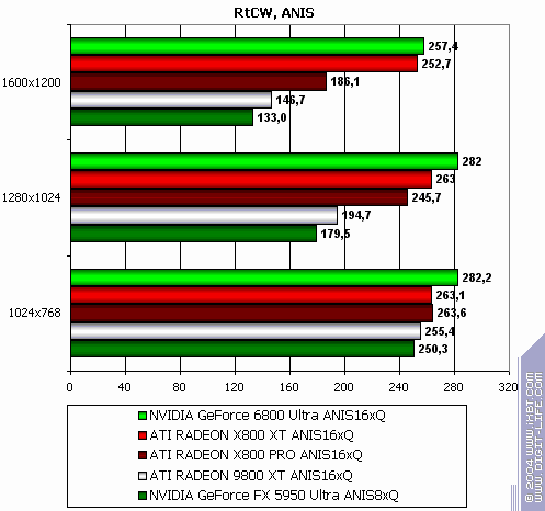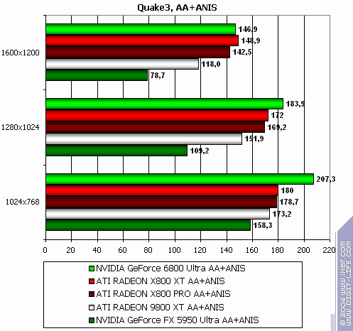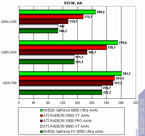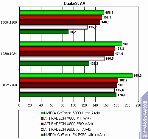 - ATI RADEON X800 XT (против NVIDIA GeForce 6800 Ultra) почти на равных, с учетом того, что в данном тесте уже давно все уперлость в CPU;