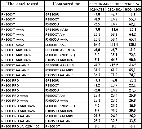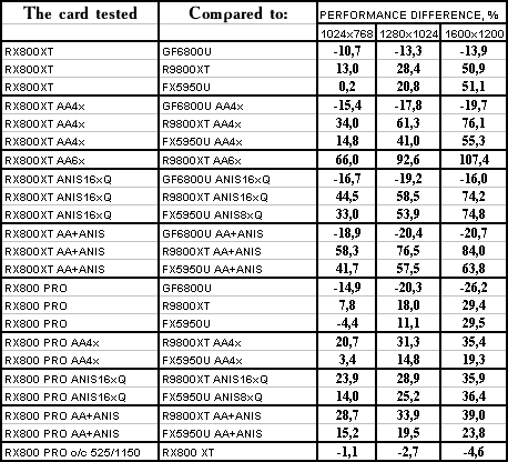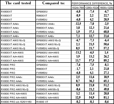 - ATI RADEON X800 PRO (против предыдущих решений) весьма неплохо, и даже проигрыш NV40U не столь велик.