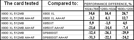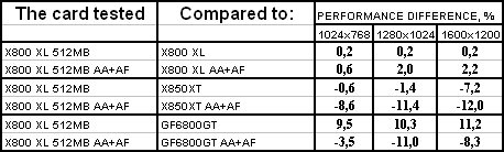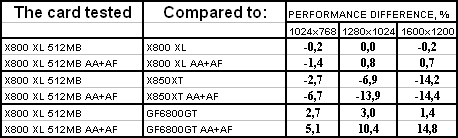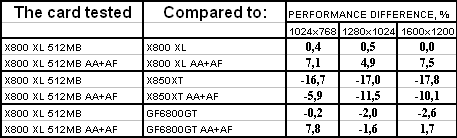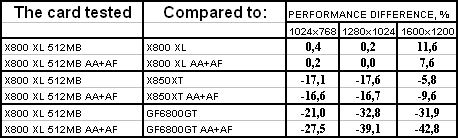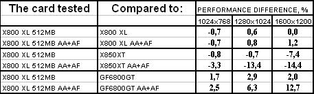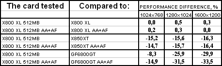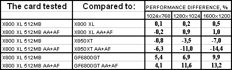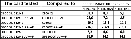 Обратите внимание на то, что в этот блок тестов было введено исследование в DOOM III при Ultra-High настройках качества. Я напомню, что эти настройки исключают работу со сжатыми текстурами (плюс сами текстуры более детализованные), и потому вся текстурная масса уже превышает 256 мегабайт (еще при релизе игры разработчики говорили, что этот режим доступен лишь 512-мегабайтным картам без потери скорости на передачу данных по шине). И именно в этом тесте мы видим яркое преимущество X800 XL 512MB над своим 256-меговым собратом. И даже удалось достичь производительности уровня X850XT! Правда, 6800GT все равно быстрее, но в этом блоке тестов всегда соперники от калифорнийской фирмы быстрее, и это уже обсуждалось многократно.