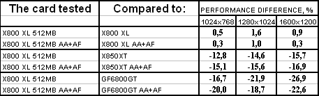 - RADEON X800 XL (ASUS EX800XL, PCI-E, 256MB GDDR3, 400/990 MHz);