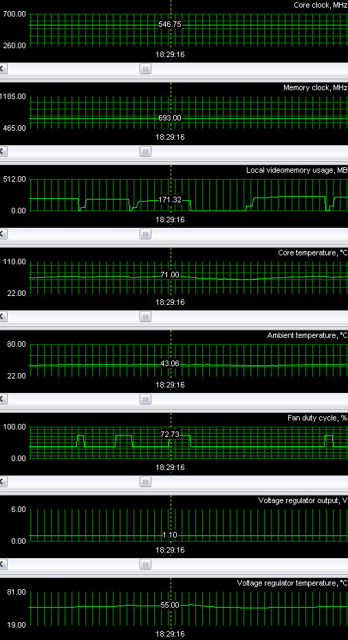 По ядру — карта может работать и на 580 МГц(!), однако случается именно то, о чем я писал в начале материала! Спонтанные перезагрузки и падения системы. Причем, даже на 560 МГц. Только вот уровень 555 МГц оказался устойчивым.