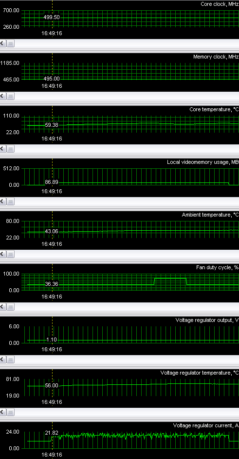 Прекрасно видно, что на X1800 XL напряжение — 1.1В. Ток, который потребляет чип без 3D — примерно 10А, а при нагрузке до 22А. Отсюда можно сделать вывод, что сам GPU потребляет от 11Вт в 2D и до 24Вт в 3D. Сопоставляя с данным о том, что общее потребление карты — около 80-90Вт при максимальной нагрузке, — можно понять, сколько «кушает» память (и ряд трат на обслуживающие нужды).
