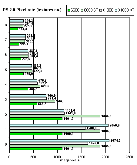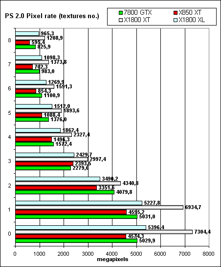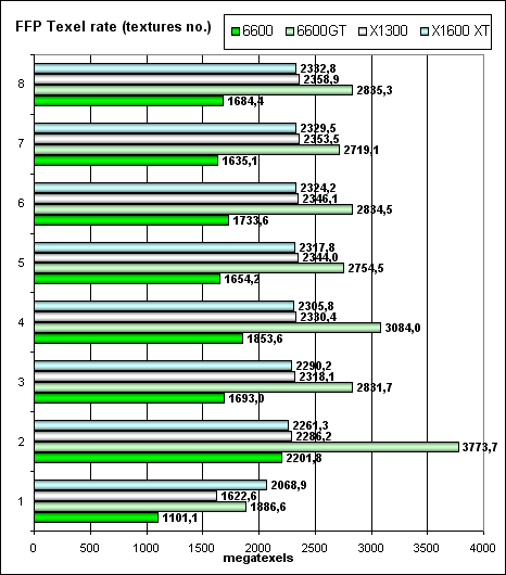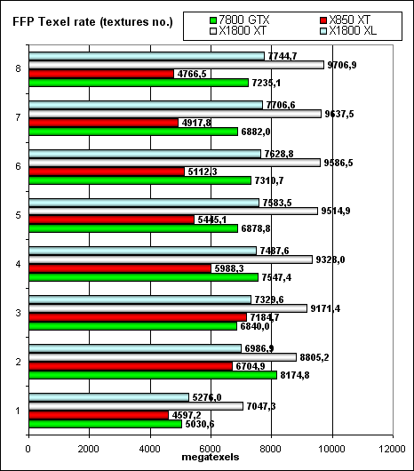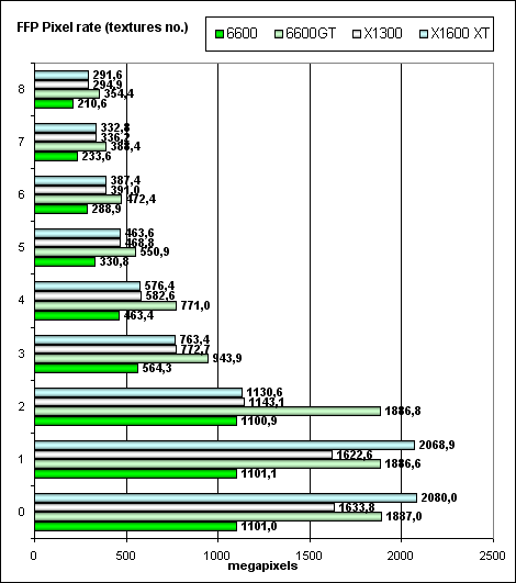 А сейчас — скорость закраски буфера кадра (fillrate, pixelrate), режим FFP, для разного числа текстур накладываемых на один пиксель: