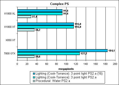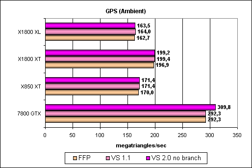 Вот здесь ATI впереди во всех случаях. С ростом сложности задачи преимущество 7800 в обработке простых треугольников пропало, а частота ядра X1800 XT дает развернуться его геометрическим возможностям. Интересно, что если шейдеры с динамическими переходами на новых продуктах ATI заработали, то такие же шейдеры с указанием модели 3.0 почему то исполняются неверно — судя по всему, мы наткнулись на ошибку в драйверах или странности при его взаимодействии с нашим тестом. Но, как бы там ни было — переходы, что в 2.X динамическом профиле, что в 3.0 у нас одинаковые и мы можем оценить эффективность реализации динамических переходов у ATI. Она ниже, чем статическая версия, как и у NVIDIA, и накладные расходы чуть выше, но больше в абсолюте, из-за более мощного геометрического блока вообще. Напомним, что, к сожалению, новые продукты ATI не поддерживают доступ к текстурам из вершинных шейдеров.