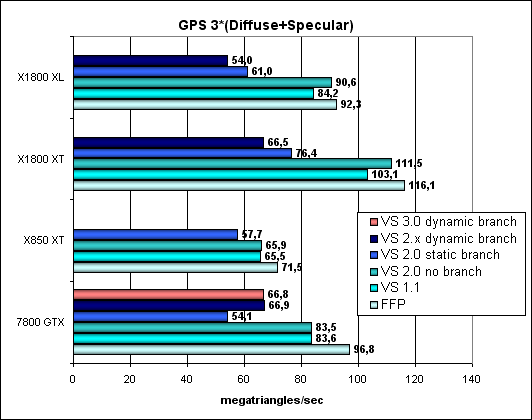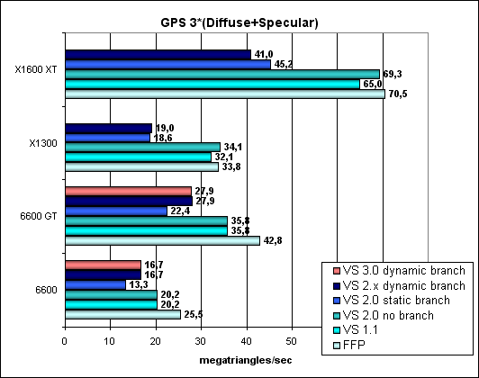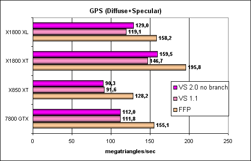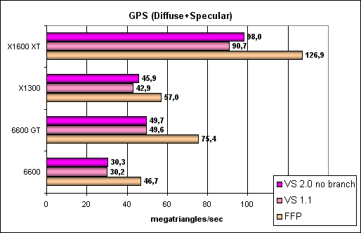 Итак, можно констатировать, что ничего не изменилось — как FFP, так и шейдеры работают совершенно одинаково с точки зрения железа (FFP эмулируется шейдером) и показывают одинаковые результаты. Все та же хорошо заметная проблема с небольшим числом текстурных блоков RV530 и все то же преимущество R520 в грубой закраске, несмотря на меньшее число пиксельных конвейеров. Тест Geometry Processing Speed