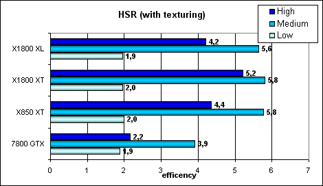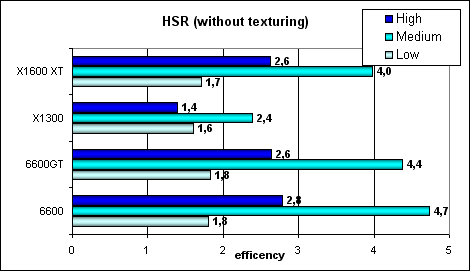 Эффективность HSR топового решения ATI традиционно выше, как и ранее. Хотя, из-за более низкой латентности работы с текстурами NVIDIA заметно лучше выглядит в случае тестирования HSR совместно с текстурированием. А вот в среднем классе все не так просто с текстурами ATI выглядит даже чуть хуже 6600/GT, особенно RV515 там HyperZ очевидно слабее, чем в старших чипах ATI.