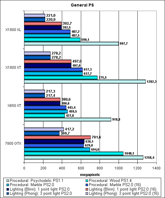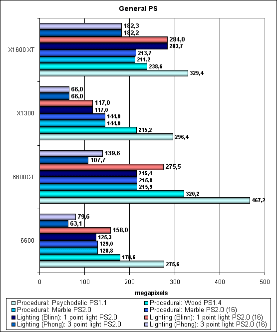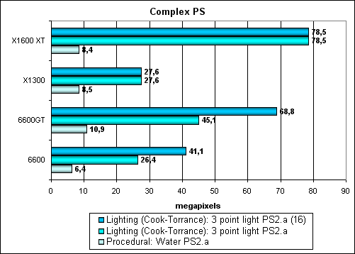 Интересно, что NVIDIA в силу наличия карусели квадов и весьма бережного отношения ко временным регистрам до сих пор получает преимущество от использования 16 битных регистров, во время обработки промежуточных данных в шейдере! А вот архитектура ATI свободна от этой зависимости — она построена по иному принципу и не зависит так сильно от числа и размера временных переменных при компиляции шейдера. Это похвально! И должно заметно сказаться на эффективности сложных шейдеров с вычислениями. Итак, посмотрим, изменится ли что-либо для более сложных шейдеров: