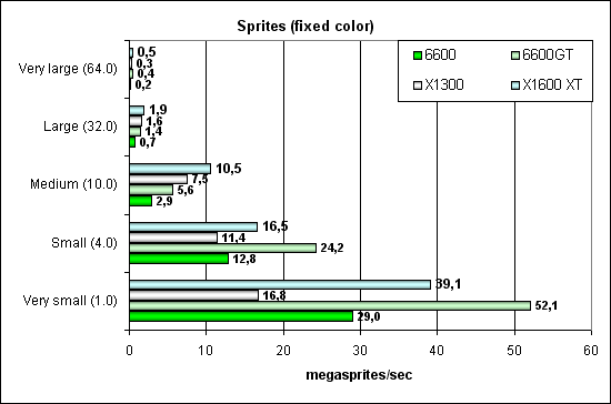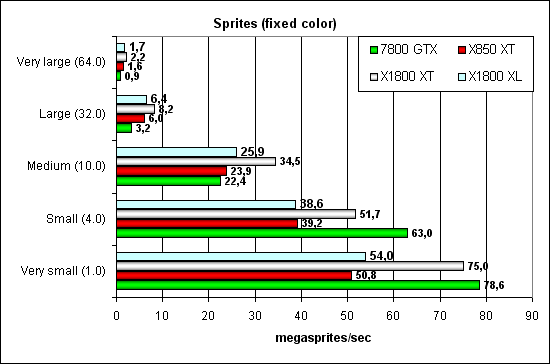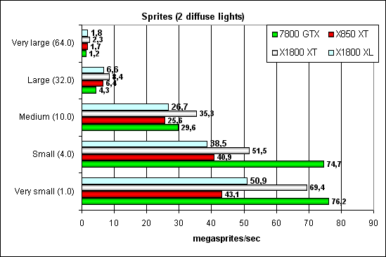 Все, как и раньше — NVIDIA лучше справляется с маленькими спрайтами, а ATI с большими. В случае освещения ATI получает еще немного преимущества — вершинные блоки там сильнее.