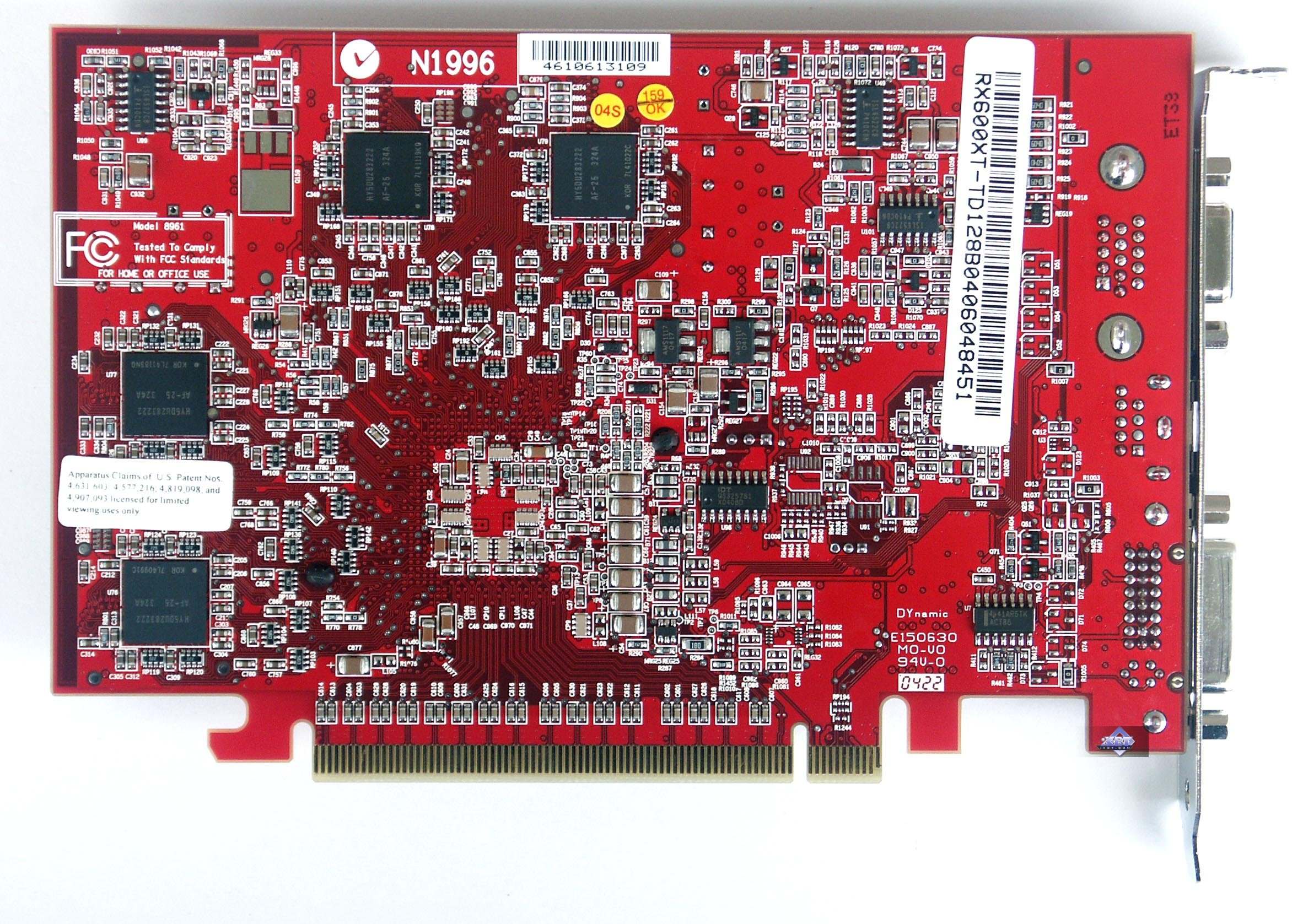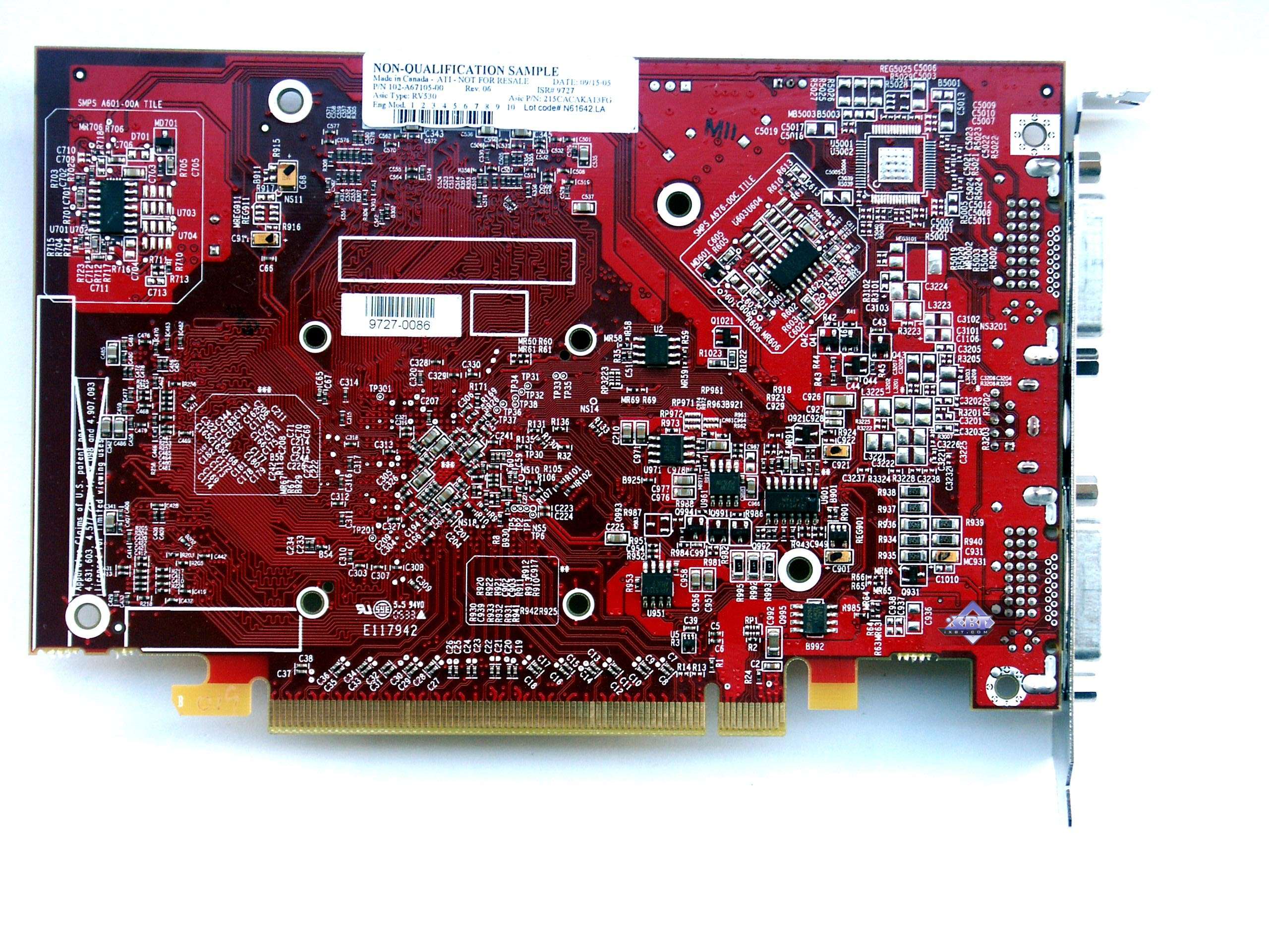 Прекрасно видно, что в серии X1800 разработчики из Канады использовали принципиально новый для них дизайн видеокарт. До сих пор мы все же имели дело с картами, чей дизайн был тем или иным развитием RADEON 9700 PRO (по 4 микросхемы на каждой стороне, всего их 8, платы короткие, силовой блок распределен по PCB). Когда дизайн продуктов от NVIDIA кардинально отличался и также шел в своем развитии еще от GeForce4 Ti (силовой блок находится в конце PCB). Начиная с NV35 и до последней поры, разработчики из США используют круговой способ расположения микросхем памяти вокруг ядра, при этом стараясь расположить их с одной стороны PCB. Лишь 7800GTX нарушил эту традицию, где, несмотря на то, что число посадочных мест предусматривает установку 16-ти микросхем памяти для образования 512 мегабайт ОЗУ, на 256-мегабайтных картах микросхемы памяти расположены через одну, занимая места как на лицевой, так и на оборотной сторонах PCB (на платах серии FX5900 128-меговые карты имели память только на лицевой стороне, а 256-меговые по обеим сторонам).