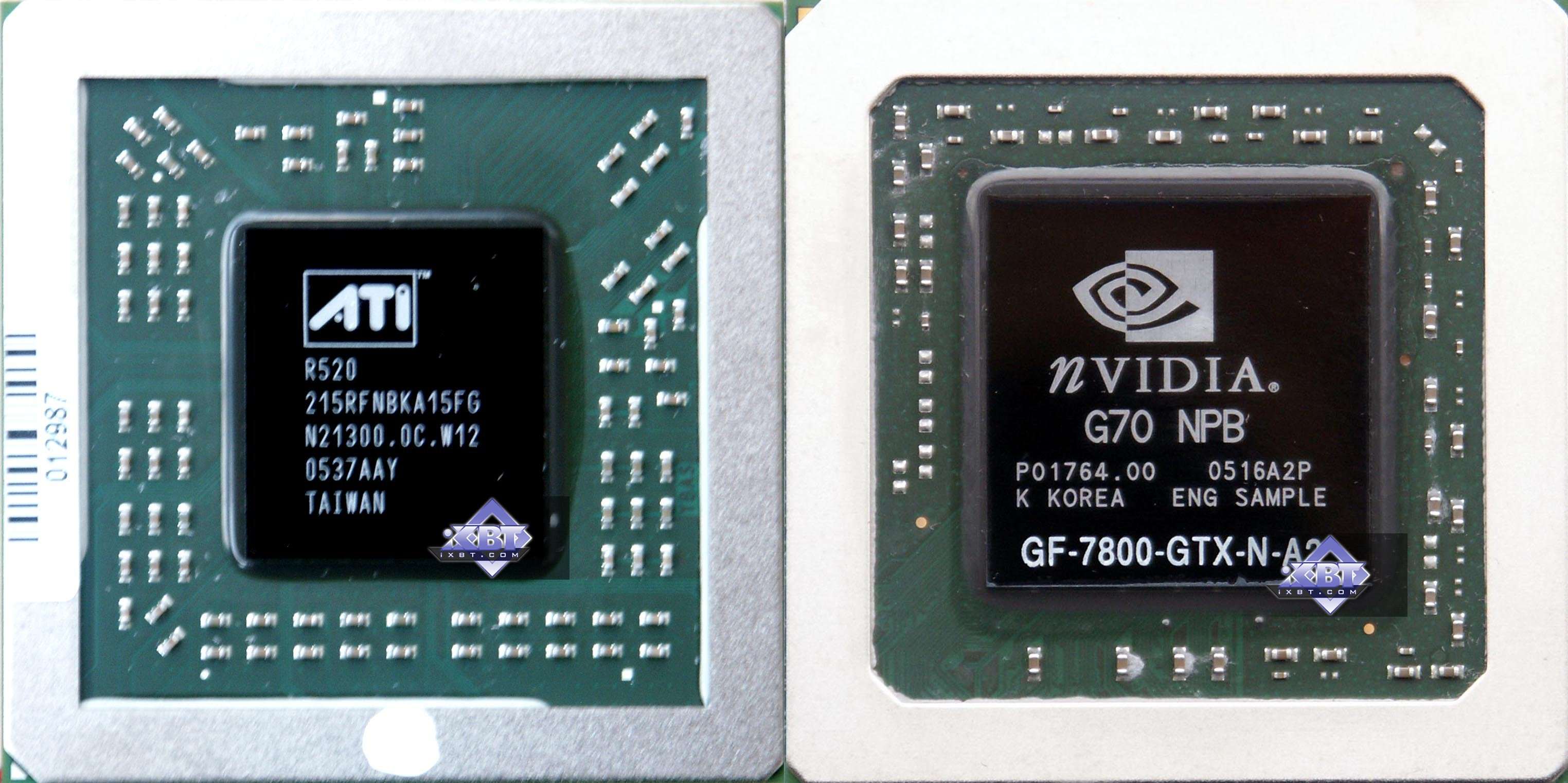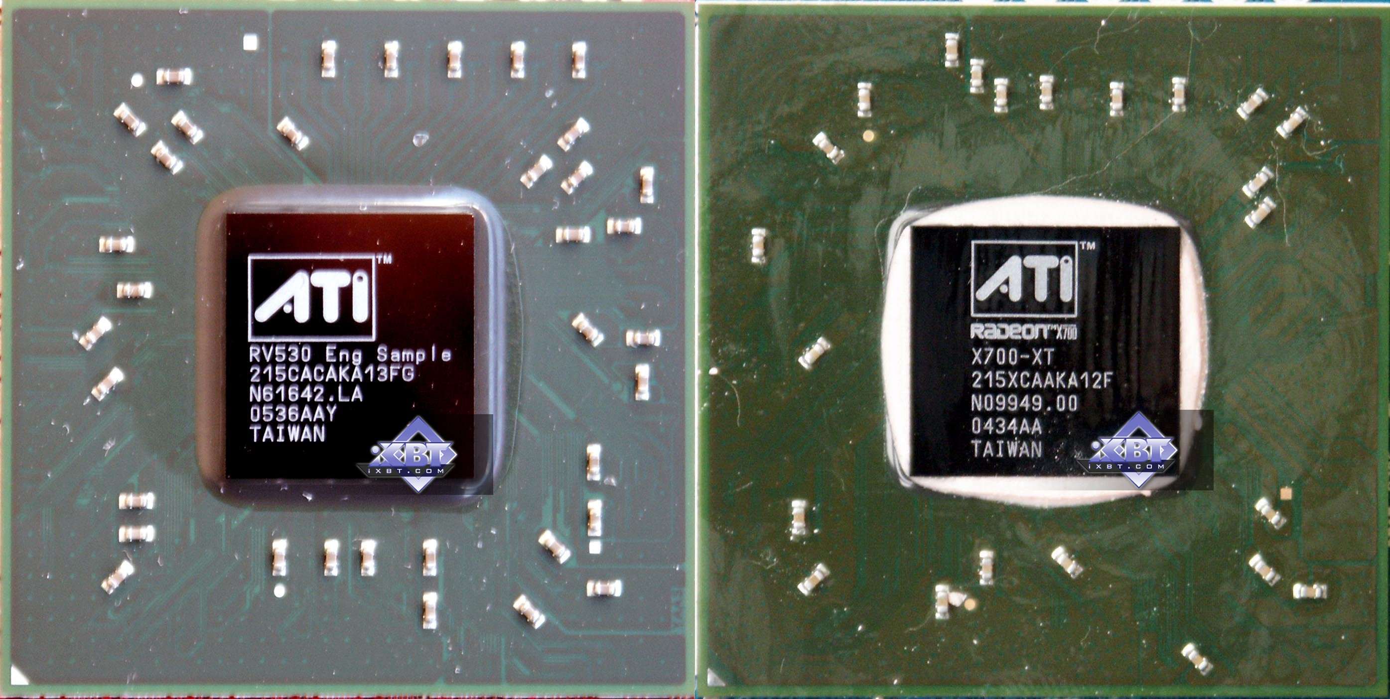 При сравнении R520 c G70 видно сразу, что продукты исполнены по разному техпроцессу, несмотря на примерное равенство по числу транзисторов, G70 имеет ощутимо бОльшую площадь. Также как и RV530 с его намного большим количеством транзисторов имеет равную с X700 XT площадь чипа. И аналогично RV515 по площади примерно равен RV380, хотя объем в транзисторах сильно больше.